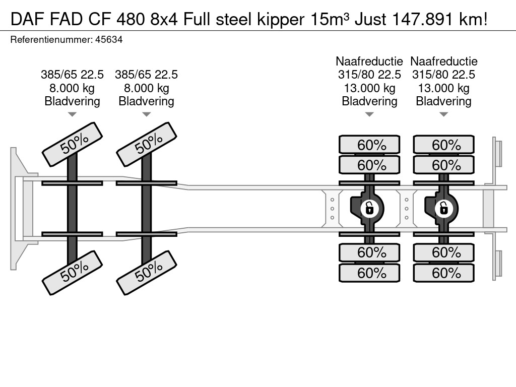 - Dimensiones del volquete trasero de 15 m³ (interior): largo 631 cm x ancho 239 cm x alto 100 cm- Puertas traseras de doble efecto