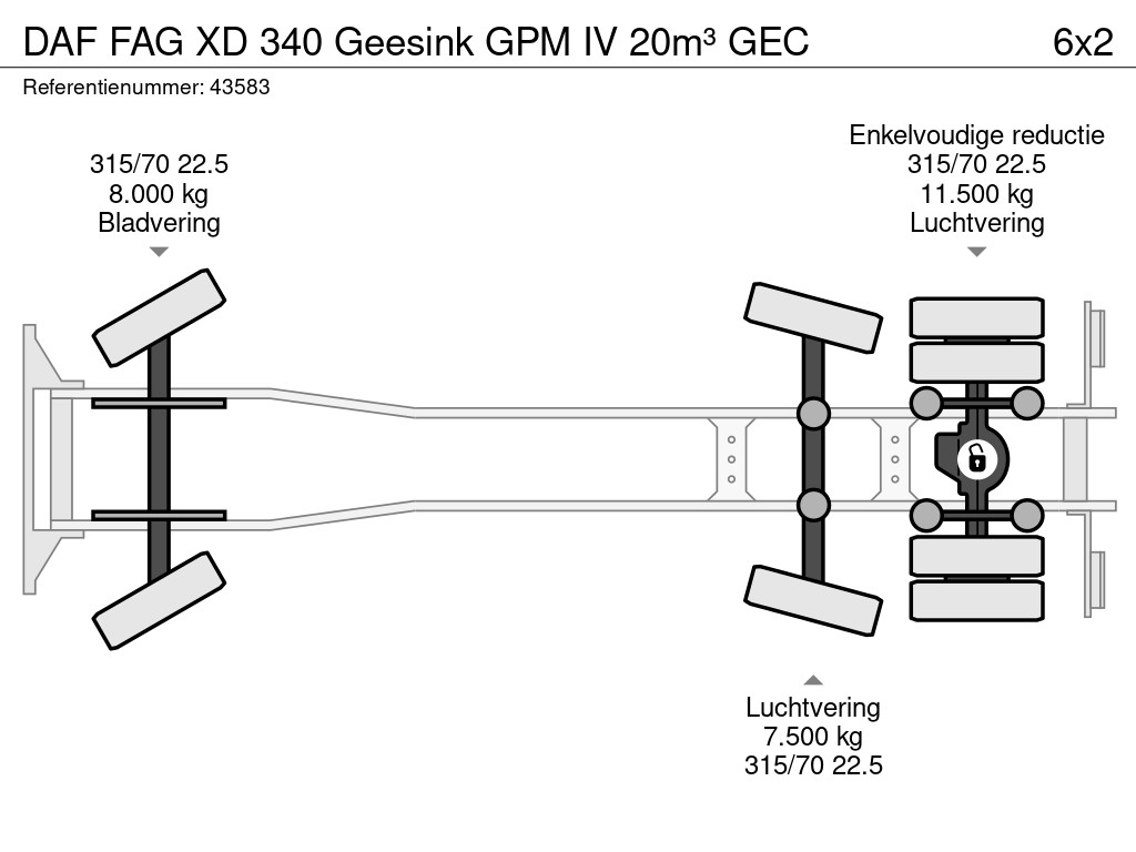 - Construcción: Geesink (tipo GPM IV 20H25), 20m³- Carga: GEC (DIN, Geesink, Kam, ETB)