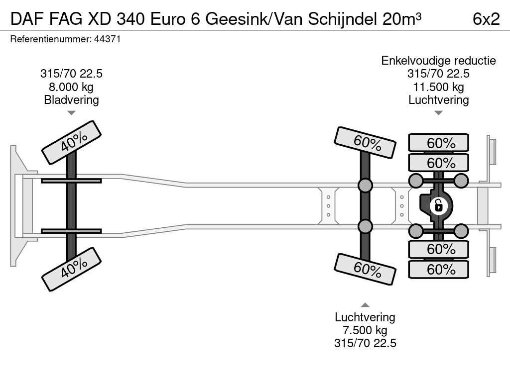 - Construction : Geesink / van Schijndel (type VSAII – 2025 SCB1700 Eurocontainer)- Système de chargement : DIN, peigne, Geesink, ETB