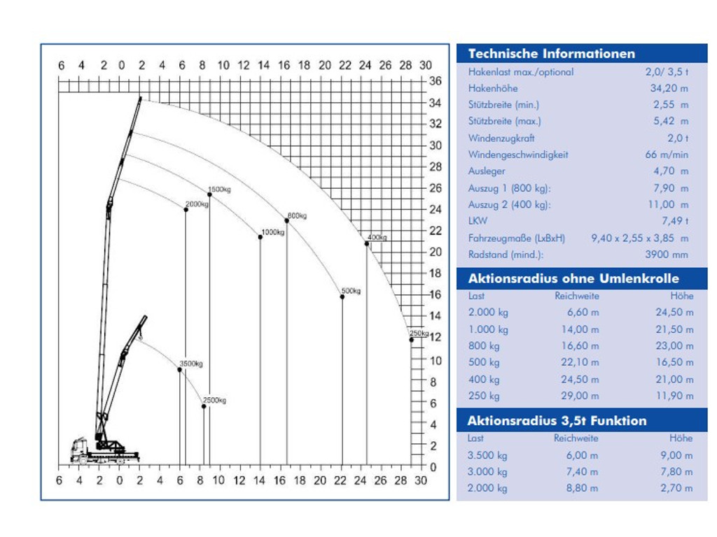 - Maximale horizontale reikwijdte: 29 meter (bij 250 kg last)